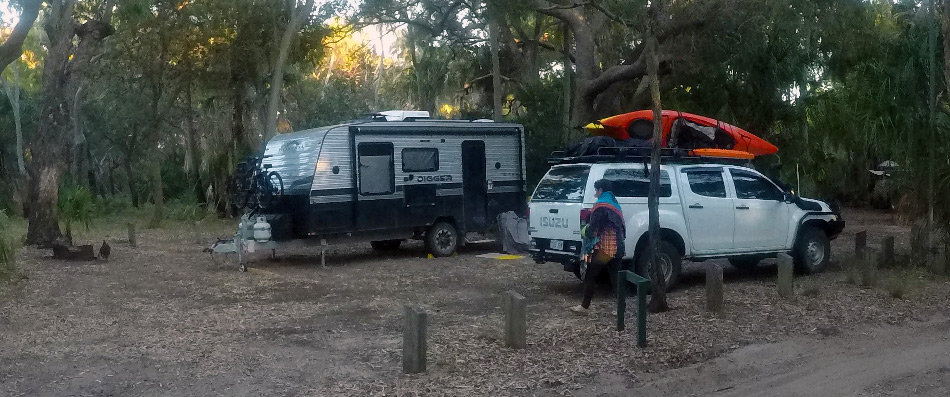 Wreck Rock Beach Camping Ground is a bit hard to get into with a caravan, we did have to engage 4WD and be on very diligent lookout for low hanging obstacles on the way in. From Wreck Rock Beach to 1770 there is a 9km 4WD ONLY track. This remoteness meant we knew we would be guaranteed to find a space. I am very please we chose this location see below.