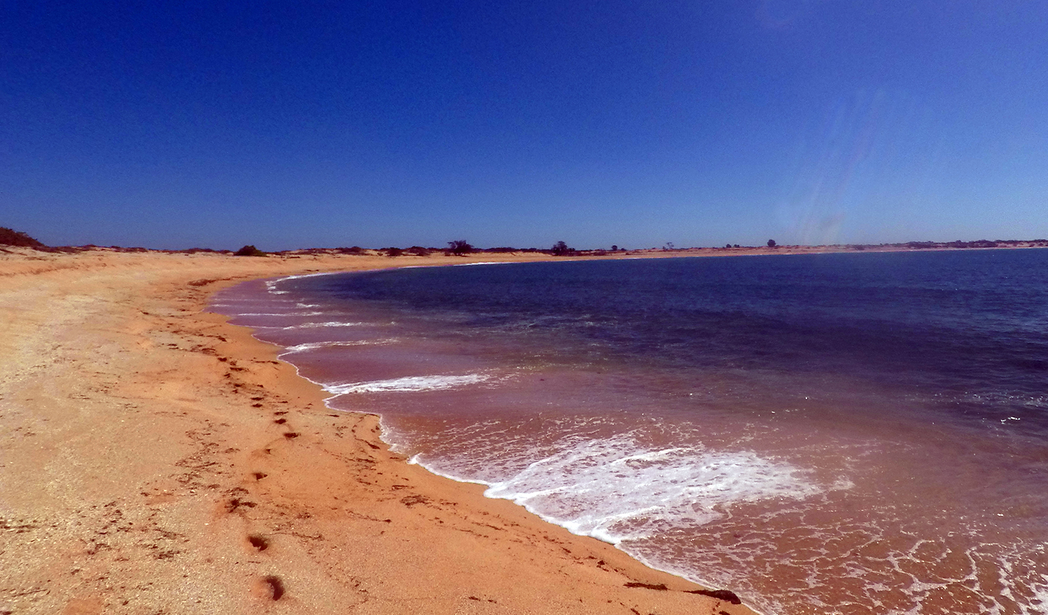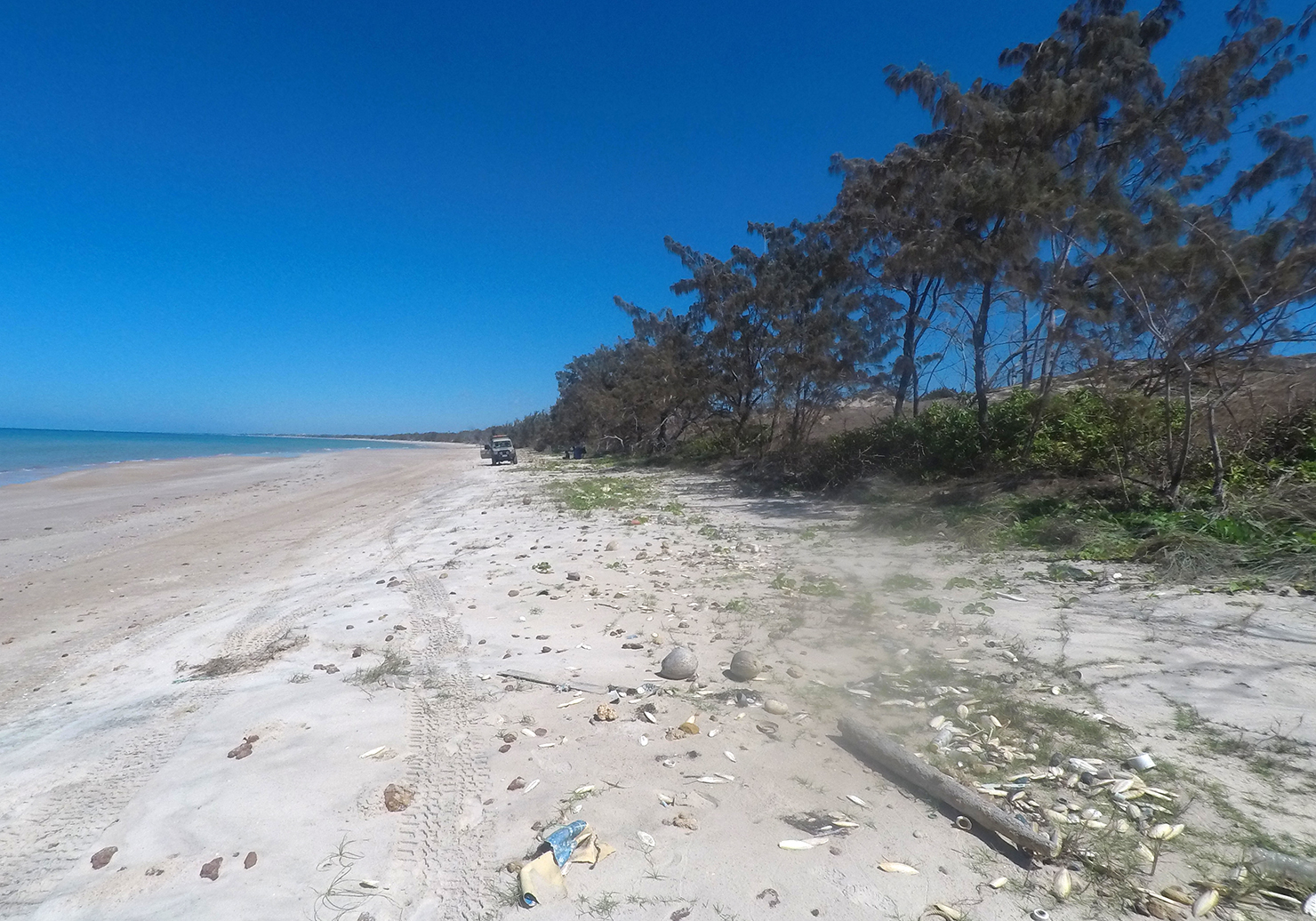 It was about a further 600 metres to the geographical southern end from where we had parked the troopy, so I walked/ran along the beach to record the start of the beach. On my return we all piled in the troopy, and Hugh drove us north along the beach. It was evident that the beach was regularly access by other vehicles as there were other older vehicle tracks. We also spotted many turtle tracks leading up the beach to nesting sites. Along the way we also spotted pods of dolphins that escorted us along the beach, at times coming very close to shore, also at least 3 turtles swimming were in the surf zone. We parked about 1km short of the end of the northern end of the beach, at a place I believe called “Amurranga” where we set-up for lunch. I finished the final 1km on foot to record the northern end of the beach. Near the lunch location I collected a sand sample as was the standard procedure for all the beaches visited and now sent home to add to our collection of sand samples stored in Canberra.