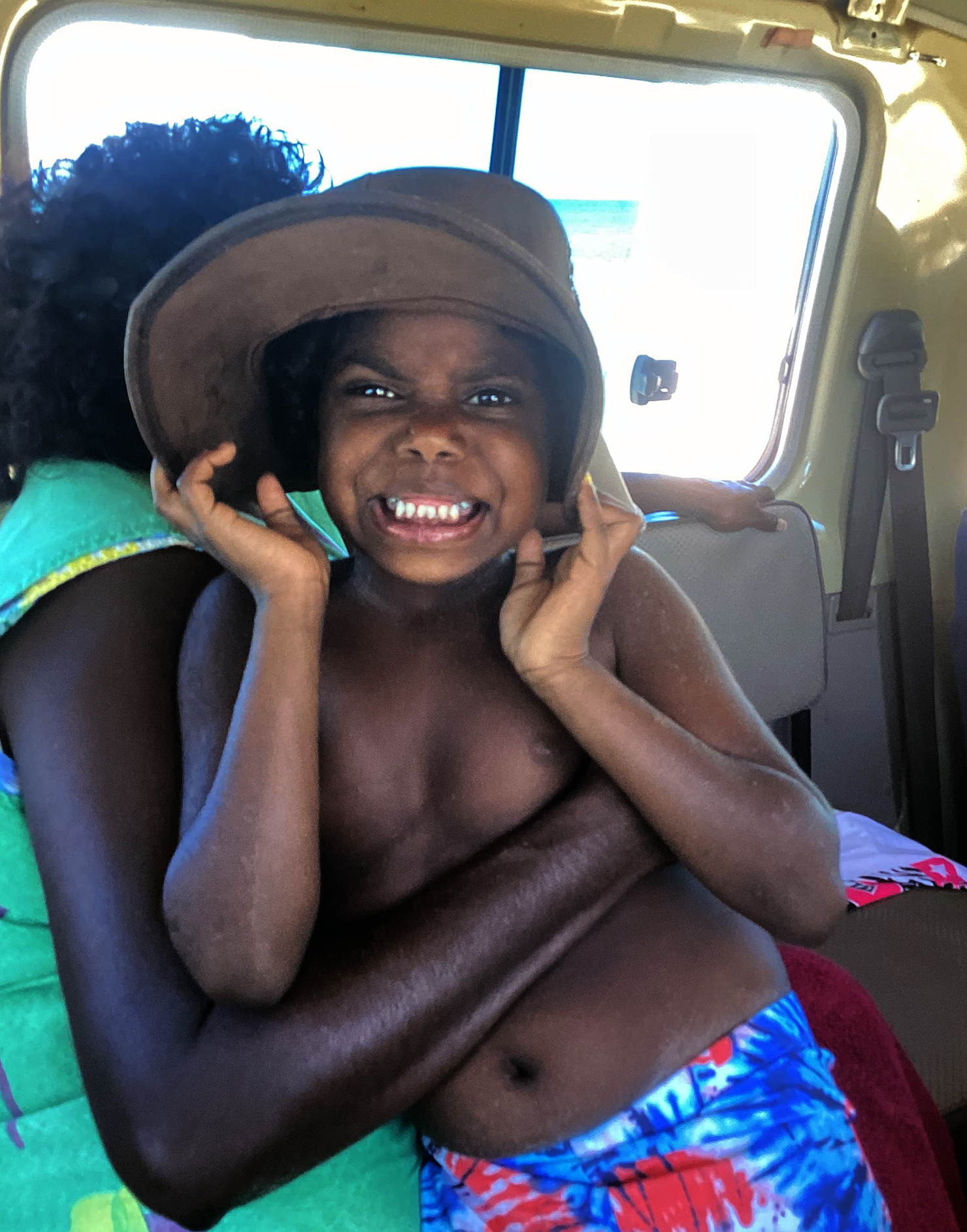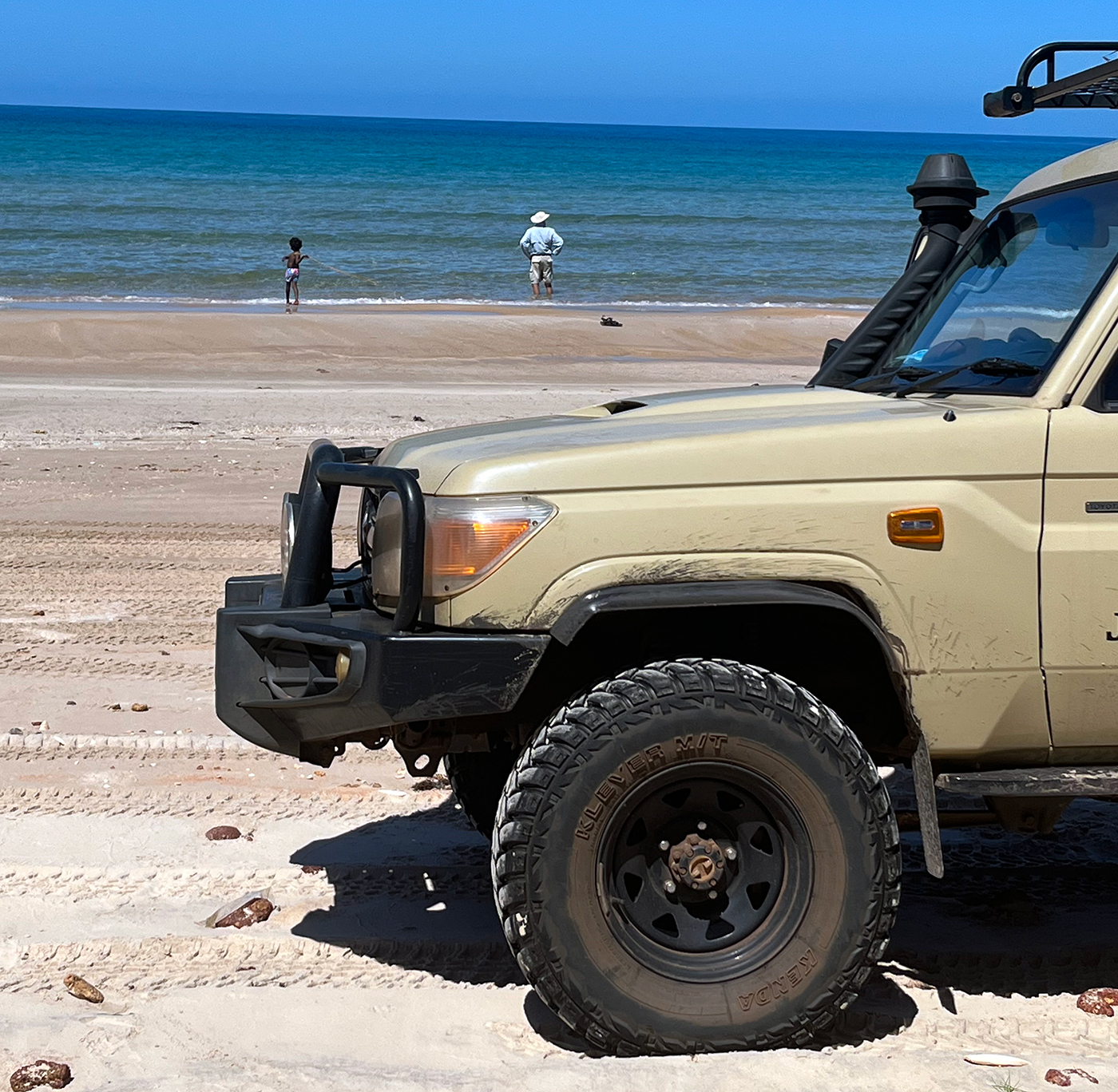 As the access track to eight Mile Beach was a bit beyond our 4WD hire car we piled into Hugh’s troop carrier (troopy) along with Jedda, Archie and their granddaughter Sheraliza. It was not very long after leaving the Umbakumba community when we had to stop and let the tyres down on the troopy. The sand track to the beach was certainly only for skilled 4WD drivers and suitable high clearance vehicles.