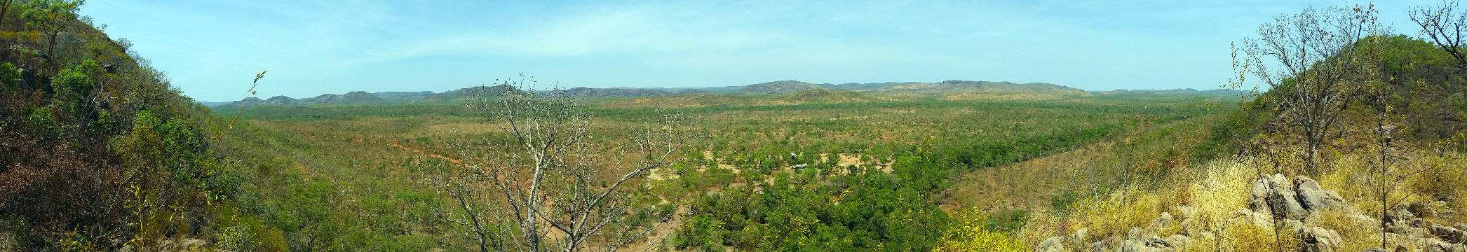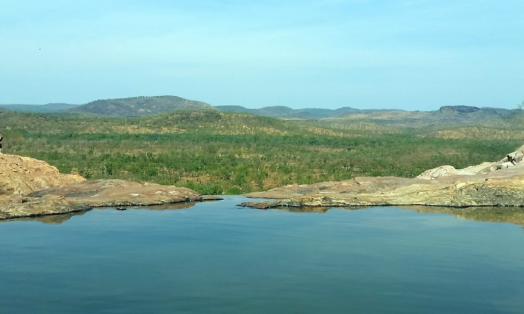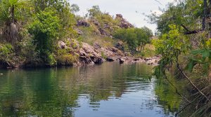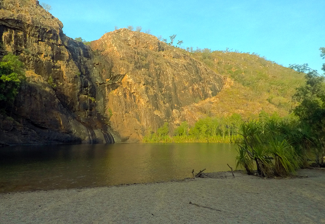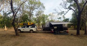The first stop in Kakadu was Gunlom Falls, arriving in convoy with our good travelling companions “Woodies from Melbourne”, but unfortunately Cat (mum Woodie) developed an allergic skin complain. So the Woodies broke camp after the first night and headed directly to Jabiru for medical assistance. We remained for an extra day/night to explore the local area. This time of year, only a trickle of water descending into the large lagoon at the base of the high falls, however the lagoon proved a very large deep refreshing swimming hole. The next day, some people advised us that Park Rangers were advising people to stick close to the small sand beach as a 3m freshwater female croc was patrolling the other side if the lagoon where the water falls into the lagoon. I didn’t get that memo the day I decided to swim the 150 metres across the lagoon.