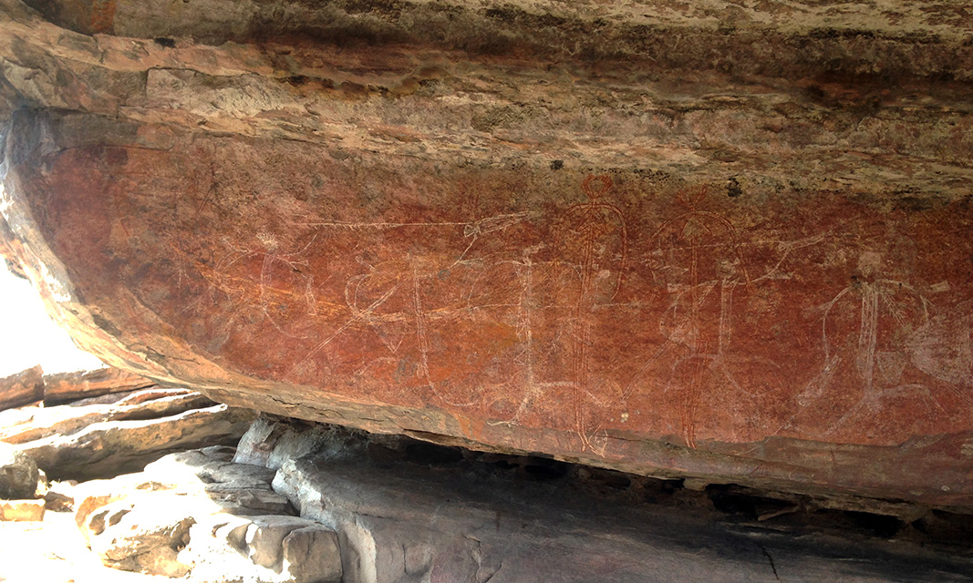 After this exciting sporting event, we had a change of pass. Within the East Alligator region of Kakadu National Park, we spent the afternoon at Ubirr. It consists of a group of rock outcrops on the edge of the Nadab floodplain where there are several natural shelters that include a collection of Aboriginal rock paintings, some of which are many thousands of years old. The art depicts certain creation ancestors as well as animals from the area such as barramundi, catfish, mullet, goannas, long-necked turtles, pig-nosed turtles, rock ringtail possums, and wallabies. Joanne was so brave still recovering from her sprain ankle, my brave soldier walk all the way up the top of Ubirr Rock to take in the panoramic view of the floodplains and escarpments.