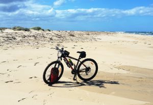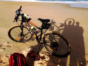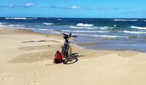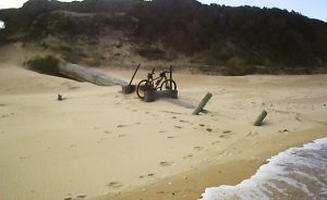 After re-setting the track log on my Garmin GPS and making a few notes on my waterproof note pad I pointed my bike in a northerly direction and started pushing the bike along the beach, close as I could to the waves washing in. The closest reliable tidal predictions had a high tide of 1.00m at 12:06 with a following low tide at 17:58 of 0.45m. As my start was still closer to the earlier high tide, I wasn’t expecting sand conditions would be very suitable for riding for some time.