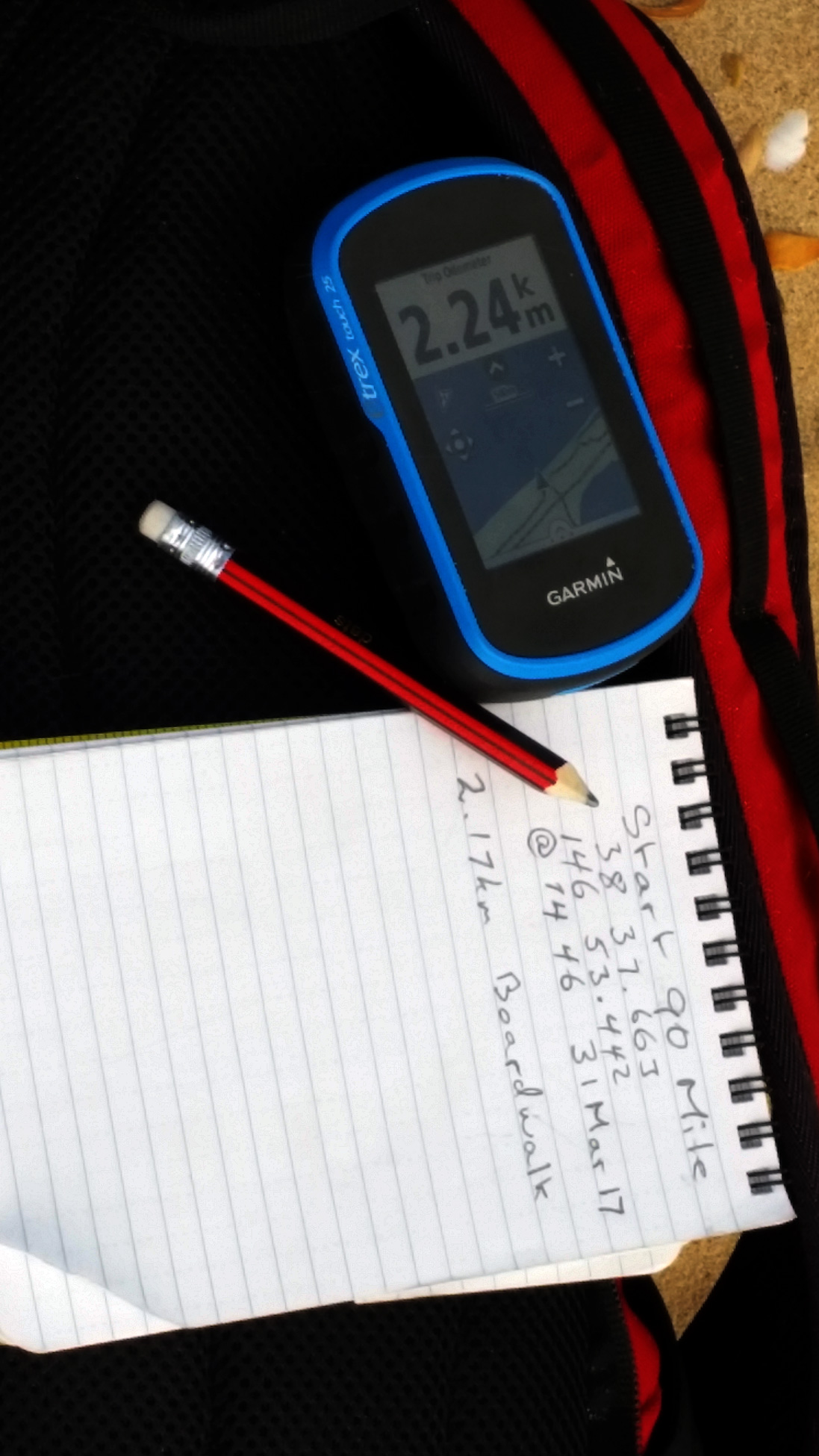 Joanne and I spent quite some time in the car-park adjacent to the McLoughlins Beach footbridge checking, rechecking, packing and repacking my stores and equipment for this first stage, the test run. The planned distance to travel that afternoon was less than 9km however I hoped it would provide some indications of the beach conditions ahead.