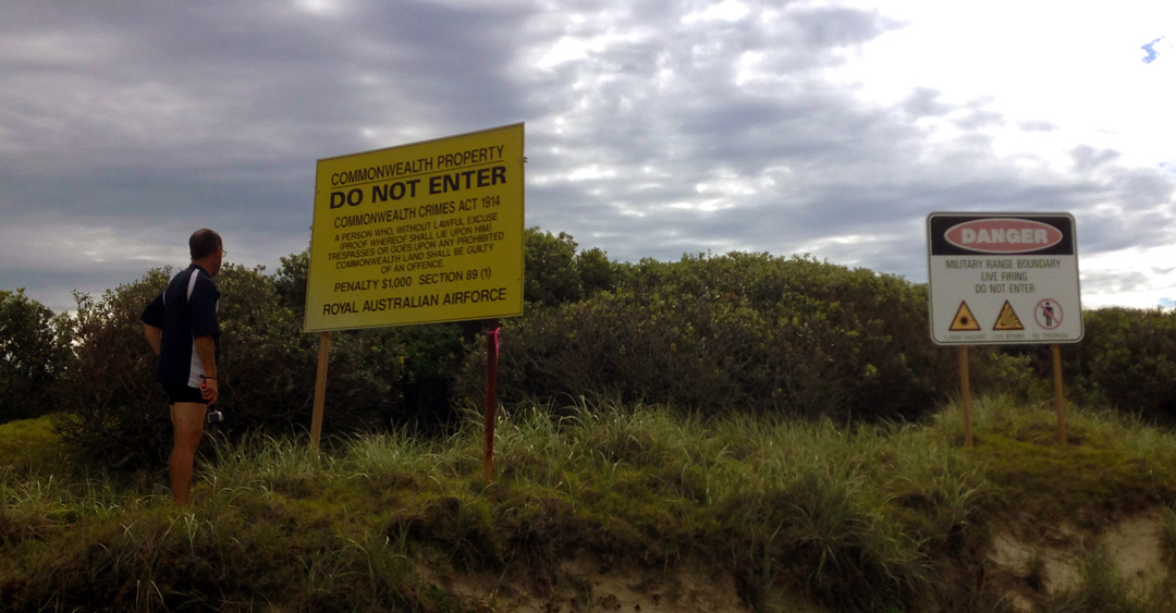 Ten Mile Beach is actually 17.6 miles or 28.5 km long. All the beach and adjoining barrier system lies in Bundjalung National Park. Access to northern end of the beach is restricted by the presence of a RAAF bombing range. There is a great big sign informing “person who without lawful excuse trespasses or goes upon any prohibited Commonwealth land shall be guilt and pay $1,000”. Interesting it also states that “Proof whereof shall lie upon HIM”. My guess is they just assume that all females trespassers are not stupid enough to go wandering around on a military bomb littered range.